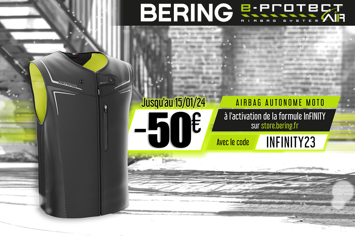 Pour aider les motards à rouler protégés en toute saison, suite à l’achat d’un gilet E-Protect Air, Bering propose une remise de 50 € pour l’activation de la formule d’achat InFINITY avant le 15 janvier 2024.