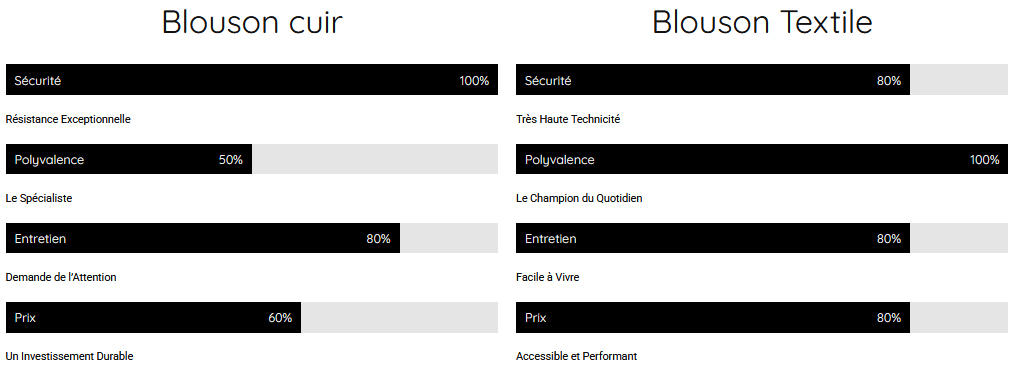 Côté budget, le textile est généralement plus accessible. Tu peux trouver des blousons très techniques et bien équipés pour un prix maîtrisé, car les matériaux sont souvent moins coûteux à produire.