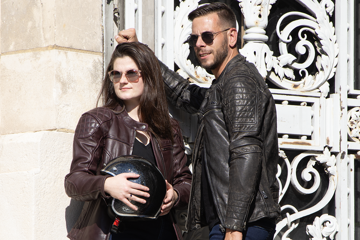 Nous vous proposons de porter un blouson en cuir au style rétro, un jean moto qui vous protégera en cas de chute, et des baskets élégantes avec des protections adaptées.