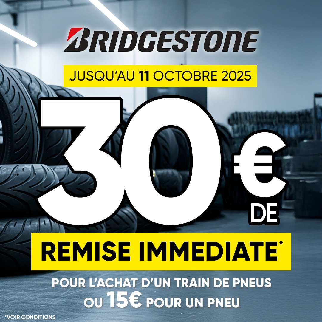 Profitez dès maintenant de 30€ de REMISE IMMÉDIATE pour l’achat d’un train de pneus Bridgestone ou 15€ de REMISE IMMÉDIATE pour l’achat d’un pneu Bridgestone.