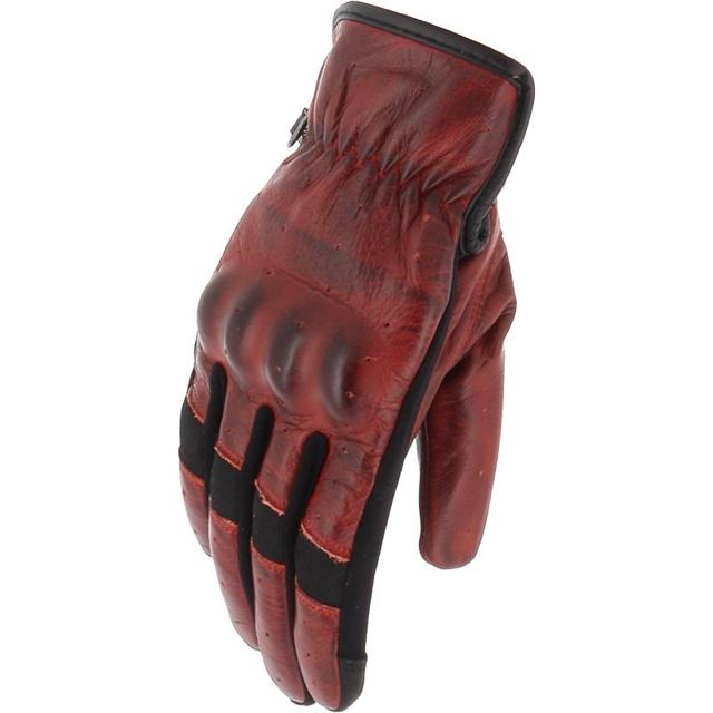 Gants été. Cuir de chèvre perforé. Manchette courte. Protection du poing par une coque carbone. Tissu élasthanne entre les doigts. Paume renforcée par des fibres aramides. Serrage poignet par velcro. Produit répondant à la norme CE niveau 1KP.