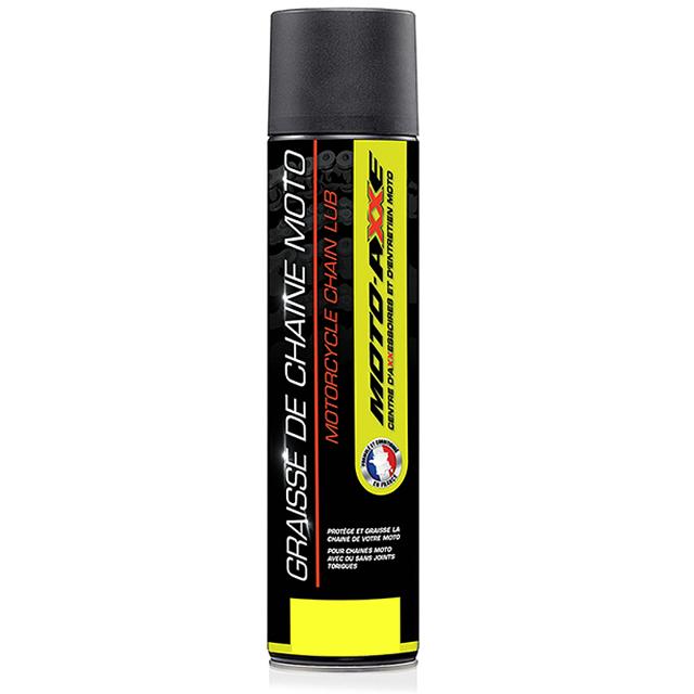 Graisse chaîne Moto Axxe 400mL . Le lubrifiant de chaine moto MOTO-AXXE est un spray chain qui pulvérise un lubrifiant très pénétrant améliorant les coefficients de friction. Pour moto route, tout terrain et quad. Cette graisse est traitée pour résister à la corrosion, elle est insoluble à l’eau et elle a un très haut pouvoir pénétrant. Son adhésivité renforcée permet un entretien durable des chaînes ; sa double action (lubrification et protection) correspond à toutes les chaînes (avec ou sans joints toriques). Cette graisse haut de gamme est destinée à l’entretien des chaînes soumises à des conditions extrêmes, elle dispose d’une adhésivité renforcée pour résister à la pluie, prévenir d’une vitesse de rotation élevée, et donc éviter des projections de graisse sur la jante. Cet aérosol de 400 millilitres vous permettra de cibler très précisément les zones à graisser avec son spray, et de protéger la chaine de la corrosion par l’eau et le sel, donc de la rouille. Pour moto route, tout terrain et quad.